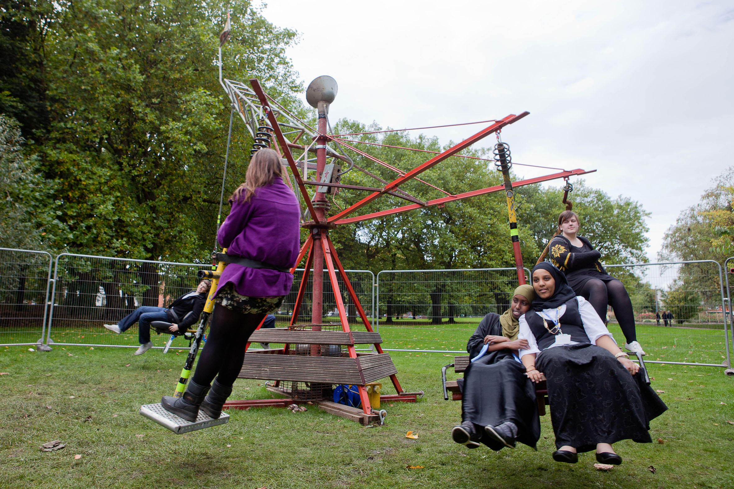 In the Summer 2010, inspired by Tarkovsky’s movie Stalker, Eva and Franco Mattes, along with collaborators Ryan C. Doyle, Todd Chandler, Tod Seelie, Jeff Stark and Steve Valdez, embarked on a journey to Chernobyl, to develop a secretive Plan C. After obtaining permissions to enter the highly radioactive zone of alienation they ventured into the ghost town of Pripyat and found an abandoned amusement park. Built for May Day 1986 as a gift to the power plant workers from the grateful Soviet authorities, the amusement park was never officially opened, the reactor exploded five days before. Finally, the group found what they were looking for: the Red Ride. The group picked through the irradiated remains. A load of scavenged materials left the Zone on a dilapidated tractor, leading west. A month later the scrap metal was sitting in an anonymous warehouse in a railway arch in Manchester, UK, where the group started secretly working day and night on The Liquidator – a replica of the Red Ride. The sinister-looking sculpture-ride was installed overnight in Manchester’s Whitworth Park. The ride operated daily for a week at the beginning of October, with thousands of enthusiastic visitors of all ages and origins enjoying . It than disappeared as fast as it had appeared.
